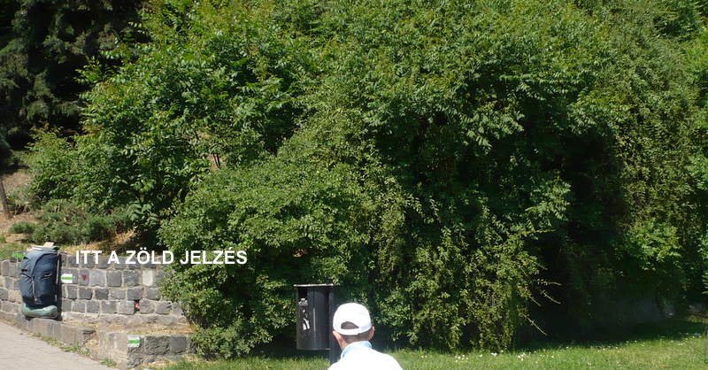 Ha tudod, hol keresd, akkor már könnyű. Sajnos az első zöld jelzés épp egy életvitelszerűen ott lakó bácsi hátizsákja mellett van. Keresd a hátizsákot, meglesz az út. 🙂 (csak most látom a fotómon, hogy kissé lejjebb is van ám egy.)