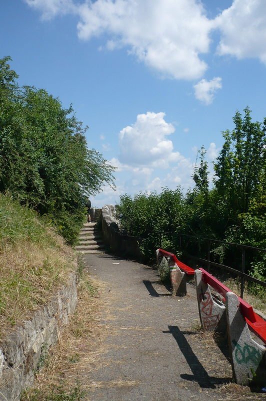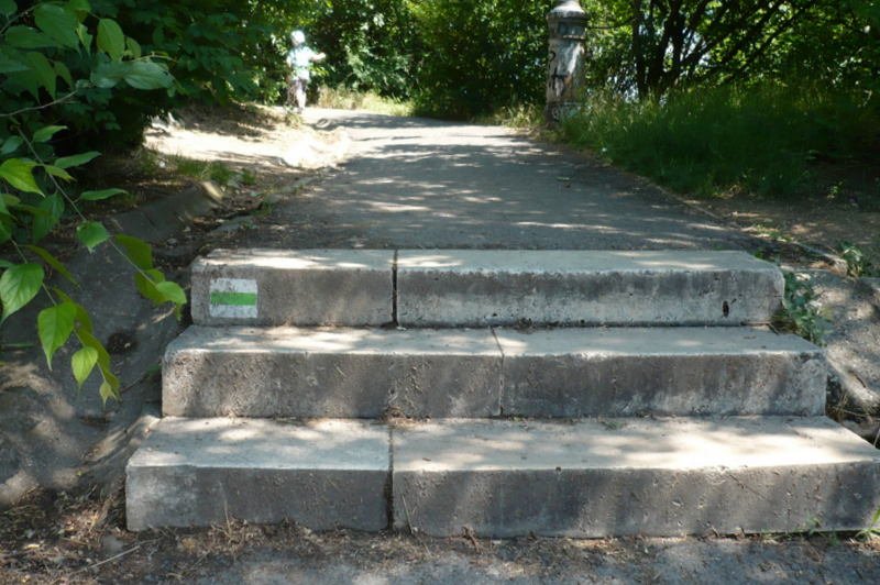 Továbbhaladunk, ismét sétaút-lépcső-sétaút-lépcső jön. A zöld jelzés viszonylag jól követhető, néhol a lépcsőn, néhol lámpákon felfestve. A gyerekek élvezni fogják, ha nekik kell megtalálni!