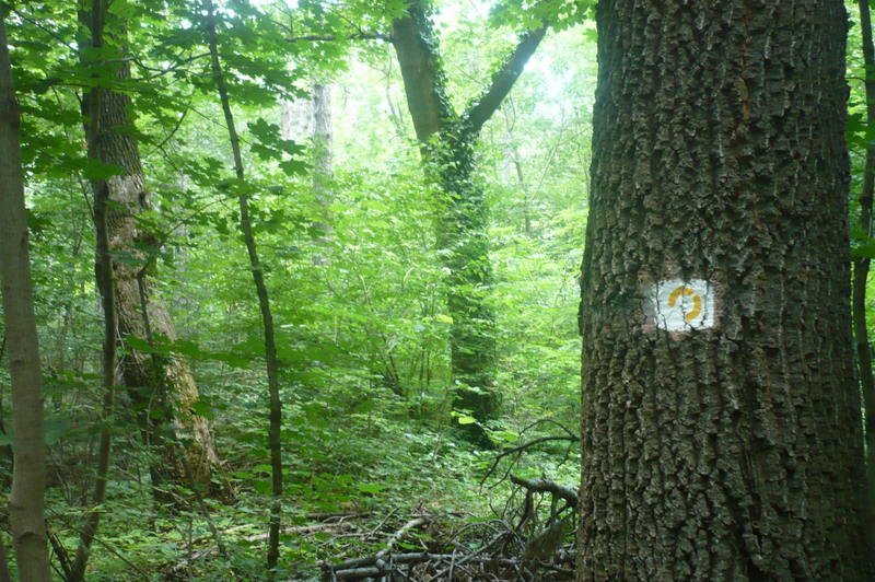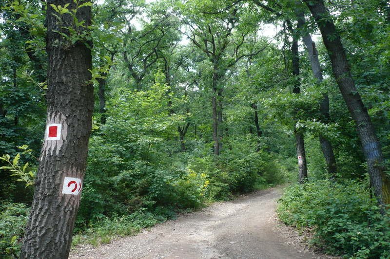 Itt egy kicsit én megkavarodtam a jelzésekkel, ugyanis a piktortégla- üregekhez a turistaházból kijöve BALRA kell indulni, ami az én térképemen a piros négyzet volt, a valóságban viszont a piros négyzet együtt haladt a piros körrel (körtúra) egy csomó ideig. A piros négyzet- piros kör kombináció viszont az én térképemen JOBBRA indult.